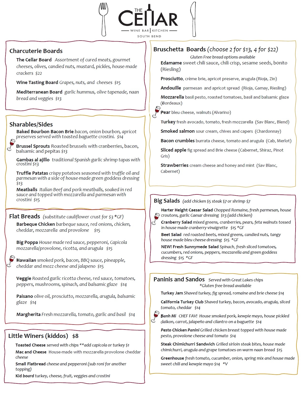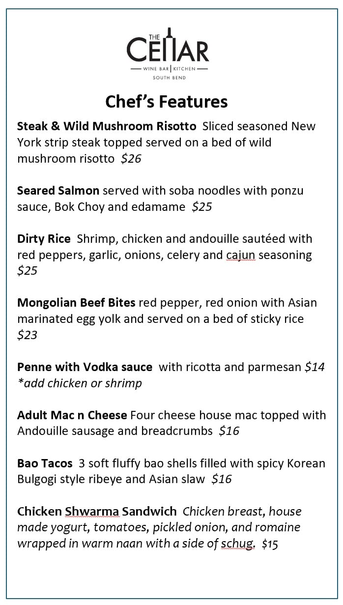 The Cellar’s mission is to connect friends, family, & the community of South Bend over great food, well-paired drinks, & carefully-chosen wines. Our menu items are great for sharing – pair a bruschetta board with a wine flight and charcuterie, or a flatbread with a salad and appetizer.
